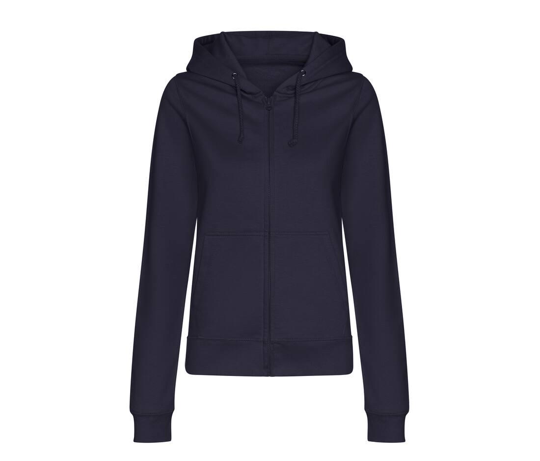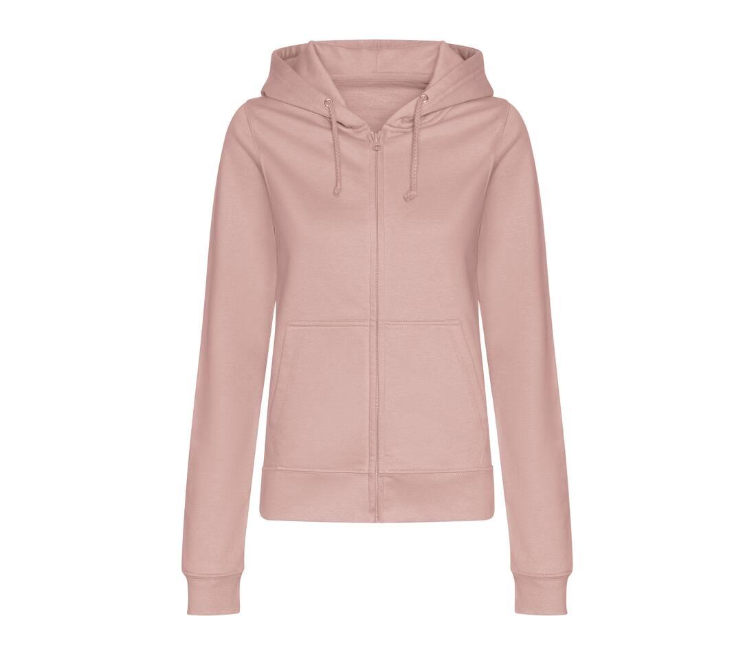 Women's relaxed fit. Covered main plastic YKK zip. Twin needle stitching detail. Double fabric hood. Self-coloured drawcords. Kangaroo pouch pockets. Tear out label. Brushed inner fleece. Ribed cuffs and hem. Soft cotton faced fabric.
