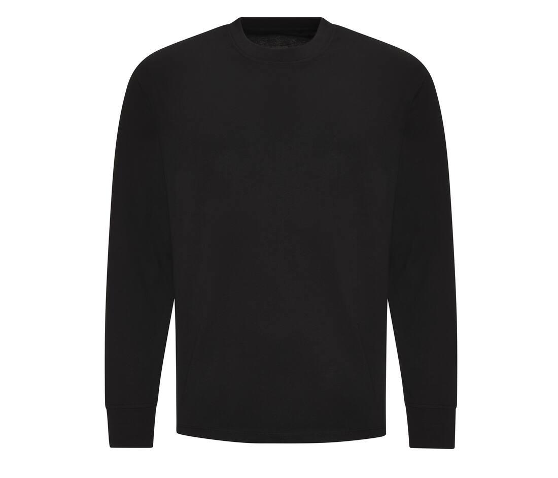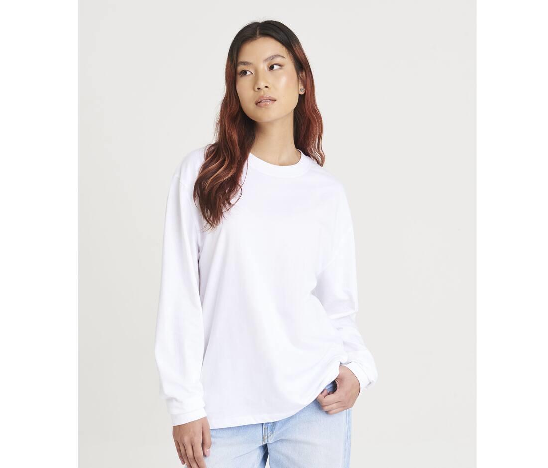 Oversize fit with side seams. Long sleeves with cuffs. Ribbed crew neck style, with taped neck. Set-in sleeves. Size label only. Twin needle stitching detail on sleeves and bottom hem.