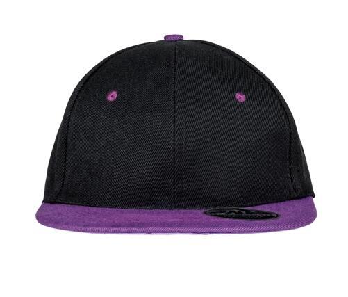 6 panels. Reinforced front panels. Flat visor with 6 stitch lines. Contrast colour peak, stitch eyelets and button. Snapback adjuster. Tear-away label. Retro style.