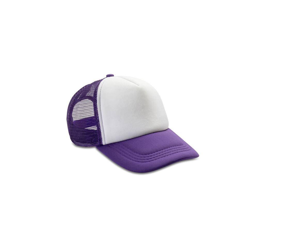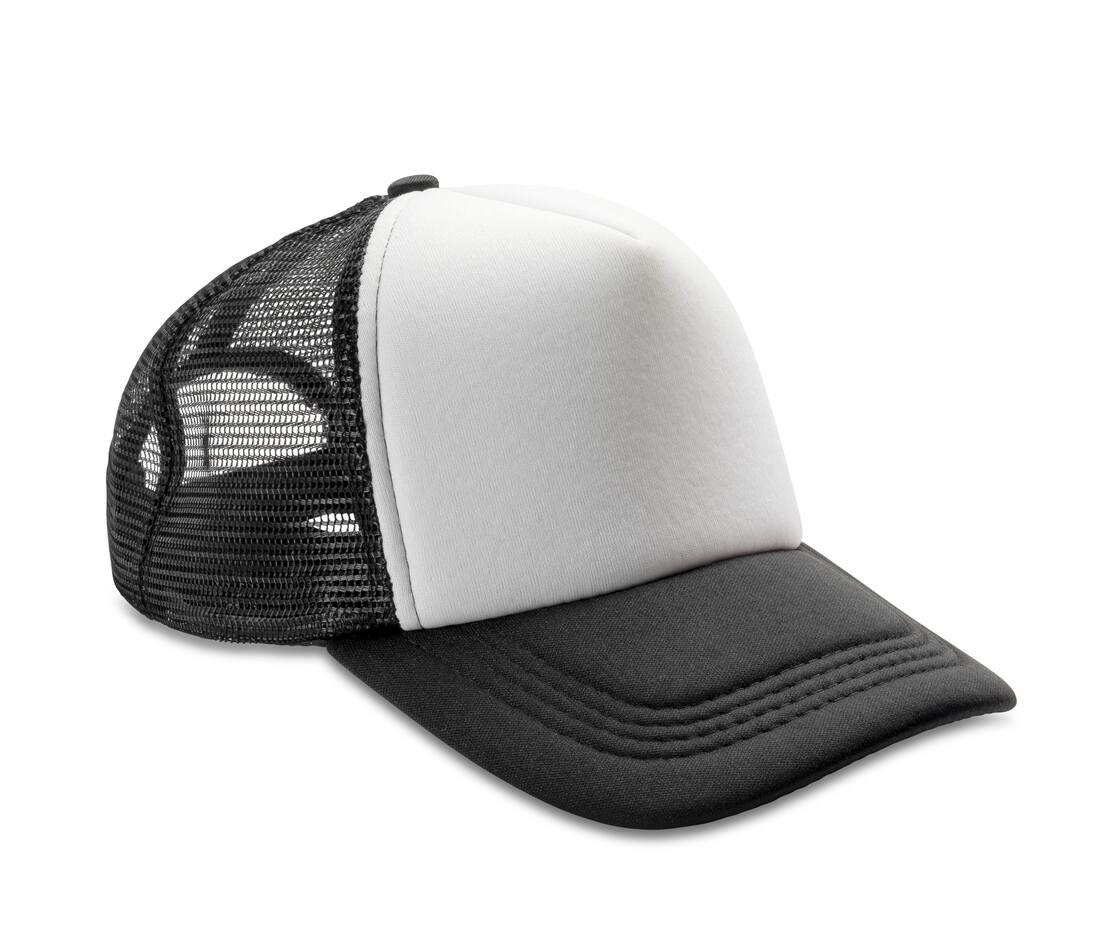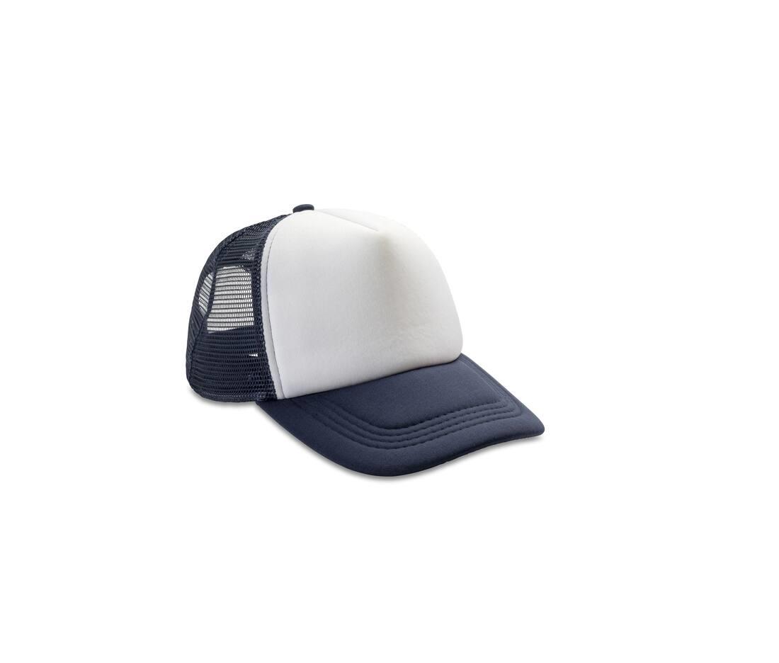 5 panel - 4 mesh & 1 fabric. White front panel with colour contrast mesh and peak. Snapback adjuster. Semi-curved fabric-peak. Double thickness. Recycled PE peak. Tear away label.