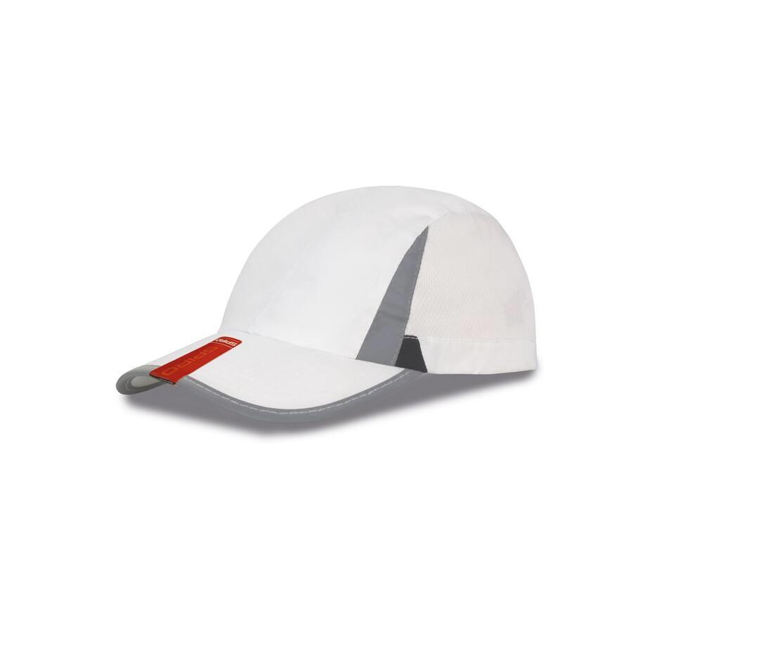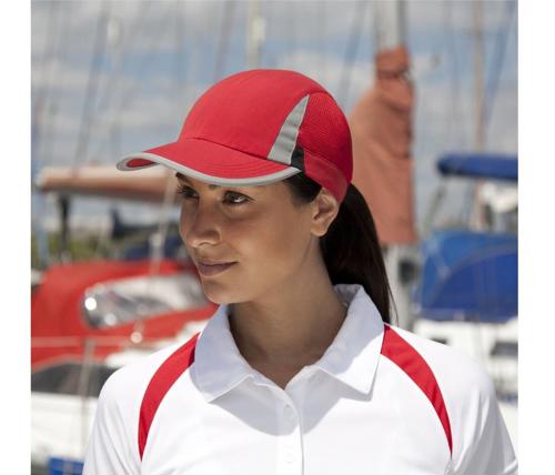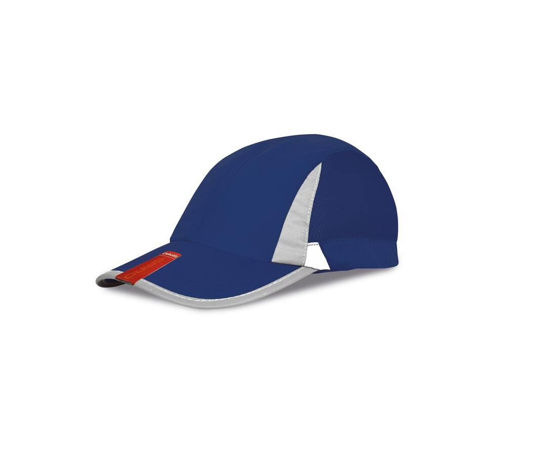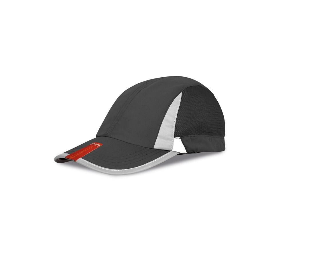 Unlined cap. Quick dry. 2 panel with mesh side panels. Pre-curved visor. Reflective detail to peak and crown. Tear release fabric size adjuster.