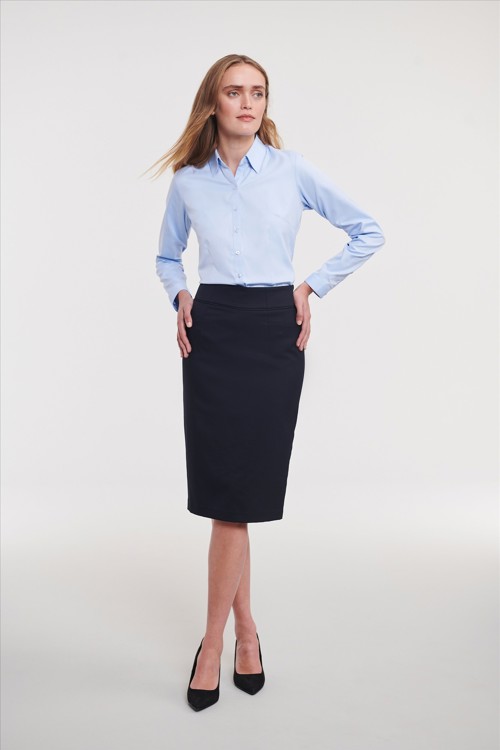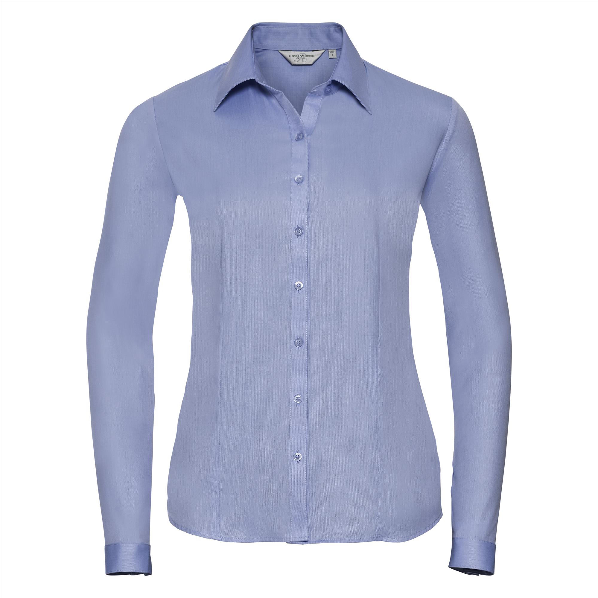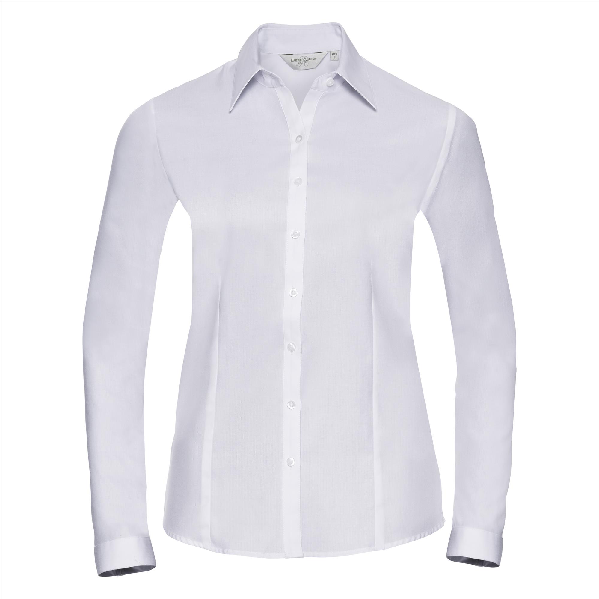 Mooi getailleerd model met smalle knoopsluiting en stijlvolle smalle manchetten met afgeronde zoom. Fijne visgraatstof en daardoor geen doorkijk van de stof. Mooie tijdloze blouse