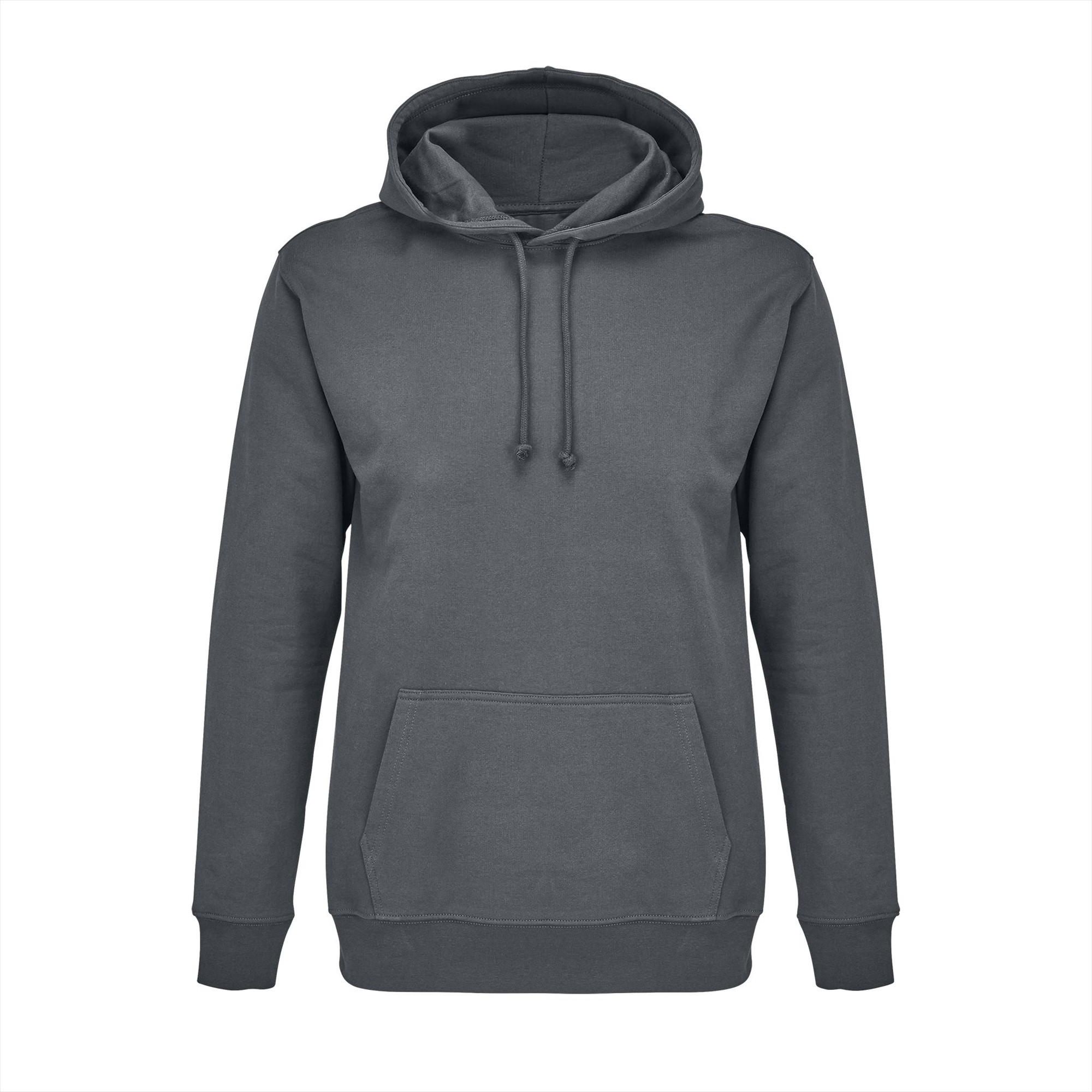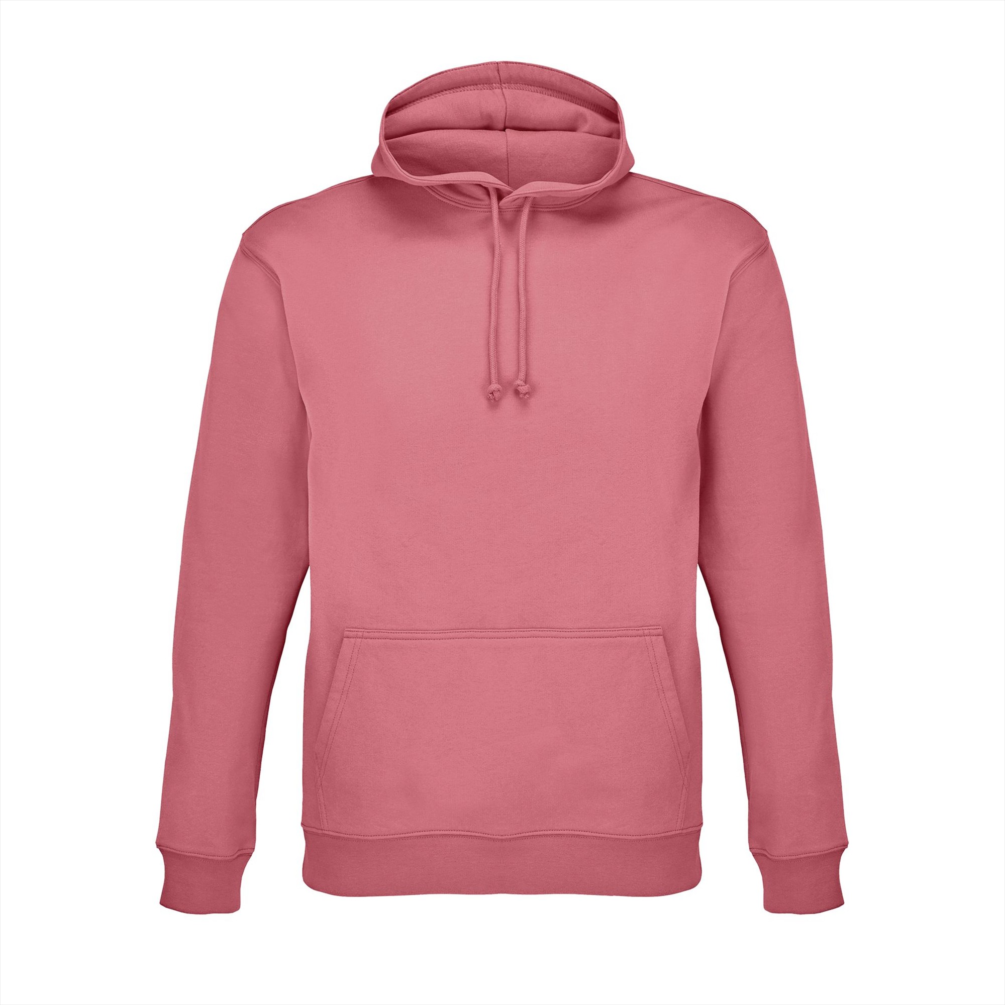 Ingezette mouwen. 2x2 ribboorden in manchetten, kraag en zoom. Kangoeroezak. Gevoerde capuchon met trekkoord en metalen oogjes in dezelfde kleur. Zijnaad.